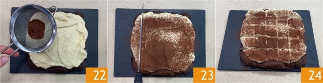 Espolvorea con el cacao amargo 22 y corta el brownie en cubitos 23. ¡Tu tiramisù brownie está listo para ser servido y disfrutado 24!