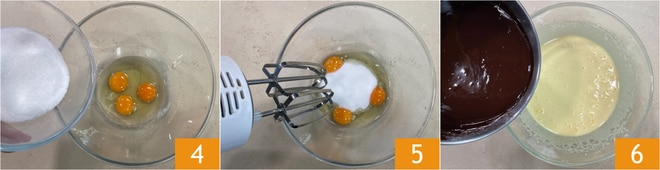 En un bol aparte, pon los huevos y el azúcar 4, luego bate con las varillas eléctricas hasta obtener una mezcla clara y espumosa 5. Añade el chocolate derretido y tibio 6 y mezcla con una varilla manual.