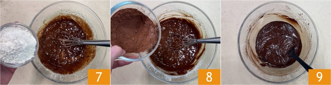 Añade la harina 7 y el cacao 8, mezclando siempre con la varilla 9.