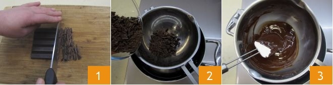 Para preparar el tiramisú de chocolate, comienza derritiendo el chocolate negro: pícalo 1, luego derrítelo al baño maría, evitando que el agua entre en contacto con el chocolate 2 (puedes alternativamente derretirlo en el microondas en varias etapas, colocándolo por 2-3 minutos, luego mezclar y volver a colocarlo en el microondas para derretirlo de manera controlada). Mezcla para que se derrita 3 y una vez listo, transfiérelo a un bol pequeño y deja enfriar.