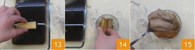Parte a la mitad cada bizcocho y sumérgelo en el café por ambos lados 13, luego coloca dos mitades en la base del vasito 14 y vierte la crema de mascarpone al chocolate 15; para crear las capas de crema puedes usar una manga pastelera desechable. Continúa espolvoreando con cacao amargo, luego sigue con otra capa de bizcochos humedecidos con el café y otra de crema.