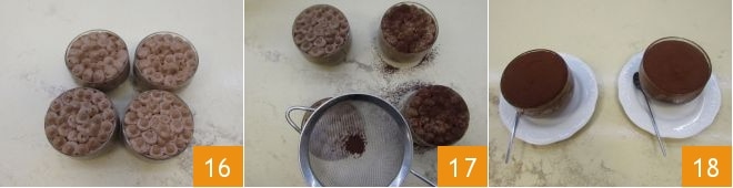 Una vez listos 16, puedes espolvorear nuevamente con chocolate amargo en polvo 17 y servir tus tiramisús de chocolate 18.