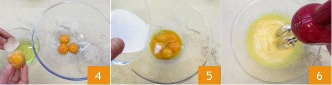 Mientras tanto, separa las yemas de las claras 4 y agrega a las yemas el azúcar 5, luego trabaja con una batidora eléctrica para obtener una mezcla espumosa y clara 6. Con las claras sobrantes puedes preparar deliciosos merengues o lenguas de gato.