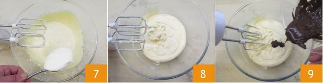 Trabaja el mascarpone con las batidoras, luego agrégalo a la mezcla de huevos y azúcar que has montado 7, mezcla nuevamente con las batidoras para obtener una crema densa 8. Cuando el chocolate se haya enfriado un poco, agrégalo a la crema 9.