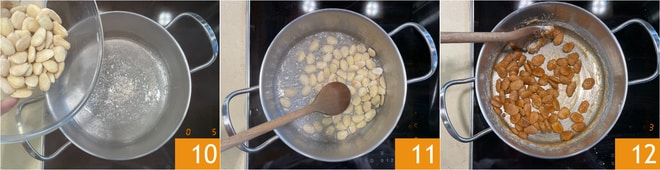 Añade las almendras 10 y remueve continuamente 11. Las almendras comenzarán a cristalizar, luego el azúcar se volverá a disolver y tomará el típico color del caramelo 12.