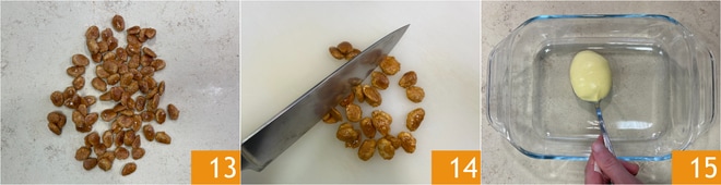 En este punto, vierte las almendras sobre una superficie de mármol 13 o sobre una bandeja de horno y déjalas enfriar. Una vez frías, pícalas con un cuchillo 14. Todo está listo para montar el tiramisú. En una fuente crea una ligera capa de crema 15.