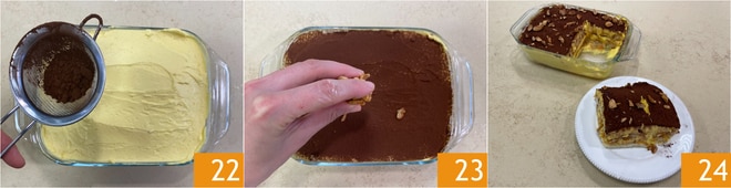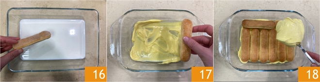 Empapa los bizcochos de soletilla en la leche 16, o si prefieres en el café, y crea una capa de bizcochos 17. Cubre con más crema 18.