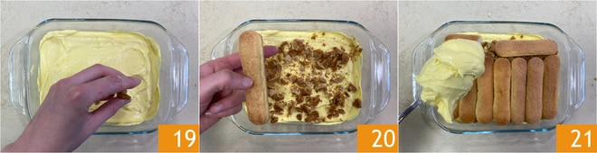 En este punto, añade la mitad de las almendras caramelizadas picadas 19, continúa con otra capa de bizcochos empapados 20 y con otra capa de crema 21.