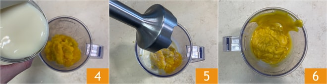 Extrae la pulpa y colócala en un vaso, añade la leche condensada 4 y luego licua con una batidora de mano 5 hasta obtener una mezcla lisa y homogénea 6. Cubre con film y deja enfriar en el frigorífico.