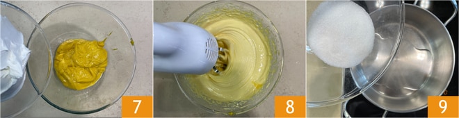Una vez frío, transfiérelo a un bol, añade el mascarpone 7 y bate con las varillas eléctricas 8 para obtener una mezcla espumosa. Deja reposar en la nevera hasta el momento de usar. Ahora dedícate a las almendras caramelizadas. En una cacerola coloca el agua y añade el azúcar 9. Haz que el azúcar se disuelva a fuego medio.