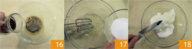 Para el baño: prepara 100 g de café de moka y déjalo enfriar, luego viértelo en un bol y añade el licor de café 16. Prepara la crema: vierte las claras en un bol y empieza a montarlas con las batidoras limpias; cuando estén bien espumosas añade 60 g de azúcar y móntalas a punto de nieve 17. En un bol mezcla el mascarpone, 60 g de azúcar y las semillas de 2 vainas de vainilla 18.