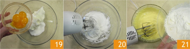 Añade también las yemas 19 y trabaja todo con las batidoras eléctricas para obtener una mezcla uniforme y bien montada. Ahora semi-monta la nata fresca líquida en un bol aparte 20 y agrégala a la crema de yemas 21. Mezcla con las batidoras para incorporarla.