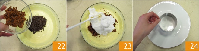 En este punto añade el chocolate negro al 70% picado finamente y el caramelo salado en trocitos muy finos (opcional) 22. Finalmente, incorpora las claras montadas a nieve mezclando delicadamente con una espátula de silicona de abajo hacia arriba. Coloca la crema obtenida en una manga pastelera. Mientras tanto, puedes preparar el molde de 10 cm de diámetro, si es posible forrado con acetato 24.