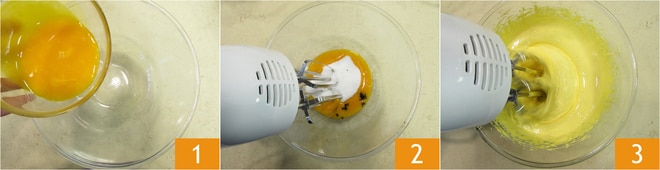Para el tiramisú de chocolate empieza por la masa de los bizcochos. Separa las claras de las yemas 1 y monta estas últimas con una batidora eléctrica junto con 75 g de azúcar y las semillas de 2 vainas de vainilla 2. Debes obtener una mezcla espumosa y clara 3.