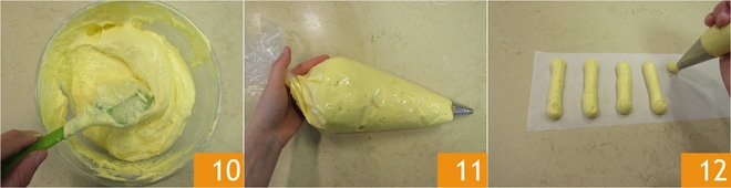 Incorpora los polvos a la mezcla de huevos y mezcla muy delicadamente siempre con una espátula de silicona, de abajo hacia arriba 11. Coloca la masa obtenida en una manga pastelera con boquilla lisa de 10 mm 12. Procede a formar los bizcochos sobre tiras de papel de horno de unos 10 cm de ancho: debes formar bastones de unos 8 cm de largo 12.