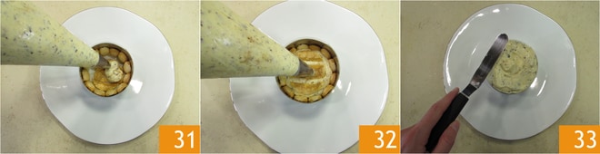 Cubre con una capa abundante de crema de mascarpone 31, luego coloca otros 3 bizcochos cortados, pincélalos con el baño y cubre con más crema 32. Nivela la última capa de crema con una espátula 33. Deja en el frigorífico durante 10 minutos.