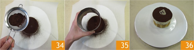 Espolvorea la superficie con cacao amargo en polvo 34. Cuando vayas a servir, desliza delicadamente el molde 35 y disfruta de tu tiramisú de chocolate 36!