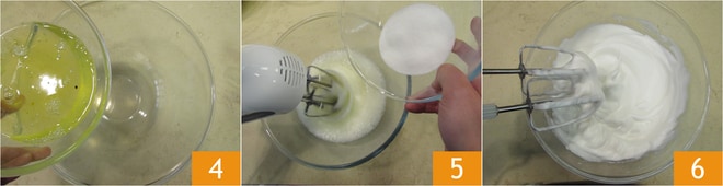 Pasa a montar las claras (no deben tener trazas de yema) con las batidoras eléctricas limpias. Solo cuando hayas comenzado a montarlas y ya estén espumosas, añade 90 g de azúcar manteniendo las batidoras en acción 5: debes obtener un montado a punto de nieve 6.