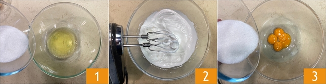 Para preparar el tiramisú sin gluten, empieza con las soletillas sin gluten: primero separa las yemas de las claras. Vierte estas últimas en un bol, añade 40 g de azúcar 1 y móntalas a punto de nieve firme con las varillas eléctricas 2. En otro bol aparte, vierte las yemas y los 35 g restantes de azúcar 3.