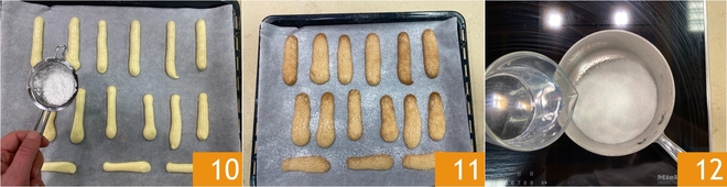 Espolvorea las soletillas con el azúcar granulada y el azúcar glas 10, luego hornea en horno estático precalentado a 180° durante unos 15 minutos. Saca del horno y deja enfriar 11. Mientras tanto, prepara la crema: en un cazo vierte el azúcar y el agua 12.