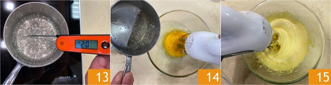 Lleva la mezcla a 121°C midiendo la temperatura con un termómetro de cocina 13; si no tienes un termómetro, el jarabe estará listo cuando se formen pequeñas burbujas blancas en la superficie. Poco antes de alcanzar los 121°C (alrededor de 115°C), comienza a montar las yemas con las varillas eléctricas. Una vez alcanzados los 121°C, viértelo en hilo sobre las yemas manteniendo las varillas en acción a baja velocidad 14. Continúa montando hasta que se enfríe completamente 15.