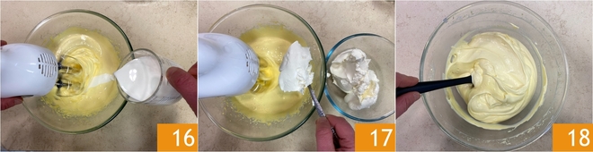 Ahora incorpora la nata fresca 16 y el mascarpone, una cucharada a la vez 17. La crema está lista cuando todos los ingredientes están bien amalgamados 18