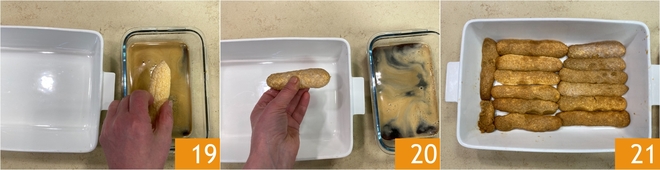Prepara el café con la cafetera moka y déjalo enfriar. Ahora puedes montar tu tiramisú: toma una fuente, sumerge las soletillas en el café 19 y colócalas en el fondo 20, para crear una primera capa 21.