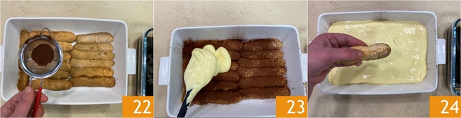 Espolvorea con una capa fina de cacao amargo en polvo 22, luego distribuye la mitad de la crema 23. Ahora monta la segunda capa: coloca las soletillas empapadas en café 24.