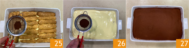 Espolvorea con el cacao 25 y distribuye la crema restante de manera uniforme. Completa cubriendo con abundante cacao 26. Deja que tu tiramisú sin gluten repose al menos una hora en el frigorífico antes de servirlo 27!
