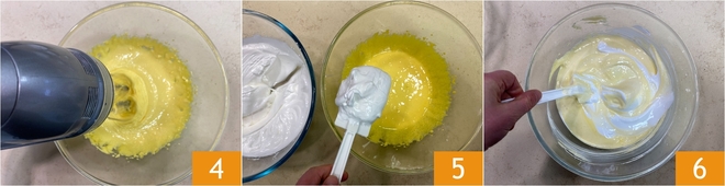 Monta con las varillas eléctricas hasta obtener una mezcla espumosa y clara 4. Incorpora las claras a punto de nieve en la mezcla de yemas poco a poco con la espátula 5, mezclando delicadamente de abajo hacia arriba para no desmontarlas 6.