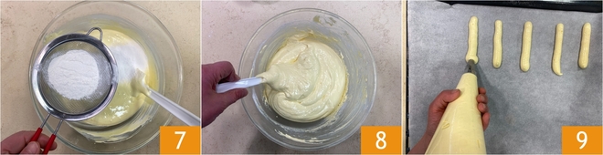 Ahora tamiza poco a poco los polvos en el bol: la harina de arroz, la fécula de patata 7, el almidón de maíz, la levadura para repostería y la xantana. Mezcla nuevamente delicadamente de abajo hacia arriba hasta obtener una mezcla homogénea 8. Transfiere la masa a una manga pastelera con boquilla lisa de 12 mm de diámetro y forma bastones de unos 10-12 cm sobre una bandeja de horno engrasada y forrada con papel de horno 9.