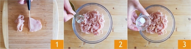 Para realizar las tiras de pollo al curry, primero corta el pollo en tiritas 1, ponlo en un bol grande, añade el aceite 2 y sal 3.