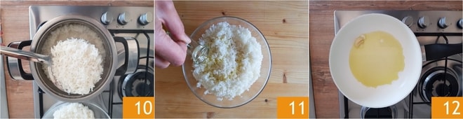 Una vez listo el arroz, retíralo del agua de cocción con una espumadera 10 y ponlo a enfriar en un bol. Luego condiméntalo con sal y aceite 11. Calienta un poco de aceite en una sartén grande, añade el diente de ajo aplastado 12, sofríe durante unos minutos para aromatizar el aceite.
