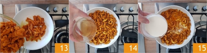 Retira el ajo, añade el pollo 13 y sofríe a fuego moderado durante unos 8 minutos, removiendo a menudo. Cuando el pollo esté dorado por todos lados, añade una pizca de pimienta, mezcla y añade también el caldo caliente 14 y la nata 15.