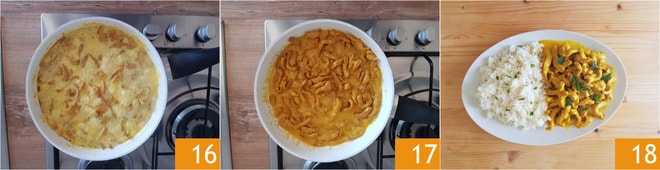 Cocina durante otros 10 minutos 16 removiendo de vez en cuando hasta que la crema se espese 17. Apaga el fuego y deja enfriar un momento. Emplata y sirve el pollo acompañado del arroz, decora el plato con hojas de perejil. Las tiras de pollo al curry están listas para ser disfrutadas 18.