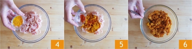 Sazona con curry 4 y pimentón 5, mezcla con una cuchara 6 para cubrir todo el pollo con las especias. Deja reposar durante 15 minutos.