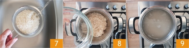 Mientras tanto, prepara el arroz. Enjuaga el arroz 7 y ponlo en una olla, cubre con agua 8 y cocina durante 10 minutos desde que hierve 9.