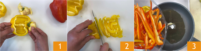 Para preparar las tiras de pollo con pimientos, primero quite el tallo, las semillas y los filamentos internos de los pimientos 1, luego córtelos en tiras anchas y luego en tiras finas 2. En una sartén, vierta un poco de aceite de oliva, añada el ajo con su piel y luego los pimientos 3. Cocine durante 15 minutos.