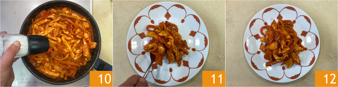 Rectifique la sal y la pimienta 10 y emplate 11. Sus tiras de pollo con pimientos están listas para servir 12.