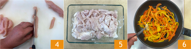 Mientras tanto, corte la pechuga de pollo en tiras 4 y páselas por harina de arroz 5. Retire el ajo de los pimientos 6.