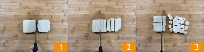Para preparar el tofu en freidora de aire, lo primero es secar con un paño de papel el bloque de tofu, luego córtalo primero por la mitad 1 y luego en tiras 2. Finalmente, corta cubos de 1,2 cm 3.