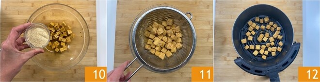 Empánalos con pan rallado 10 y elimina el exceso con un colador 11 antes de transferirlos al interior de la cesta de la freidora de aire (nosotros utilizamos una freidora con una capacidad de 6 litros) 12.