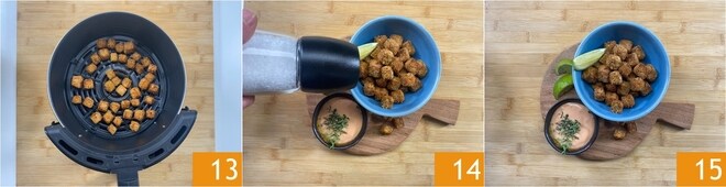 Cocina a 180° durante 15-16 minutos hasta que los cubos estén bien dorados 13. Transfiérelos a un bol, añade una buena pizca de sal 14 y sirve el tofu junto con tu salsa favorita 15.