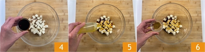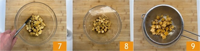 Mezcla 7, cubre con film plástico 8 y deja marinar al menos 15 minutos. Luego, escurre los cubos de la marinada 9.