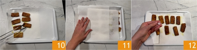 Calentad el aceite en la sartén 7 (si vuestra sartén no es lo bastante grande para contener todas las láminas, repartid el aceite y cocinad en 2 tandas). Añadid las láminas de tofu y doradlas a fuego medio durante unos 4 minutos por lado, dándoles la vuelta con delicadeza con unas pinzas 8 9.