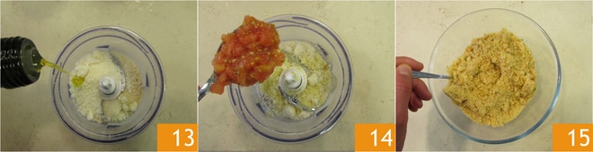 Finalmente, vierte el aceite 13 y la pulpa de los tomates escurrida 14, tritura todo en la batidora hasta obtener un pan rallado homogéneo 15.