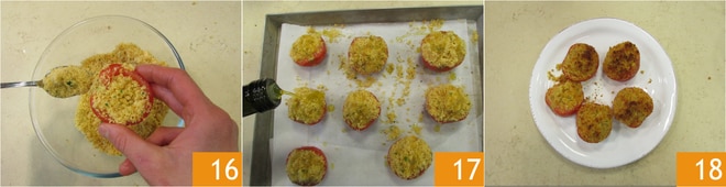 Rellena cada mitad de tomate con el relleno obtenido 16, coloca los tomates en una bandeja forrada con papel de horno, engrasa ligeramente los tomates 17. Hornea en horno ventilado a 200° durante 10-12 minutos, o hasta que estén dorados. Sirve los tomates gratinados calientes 18.