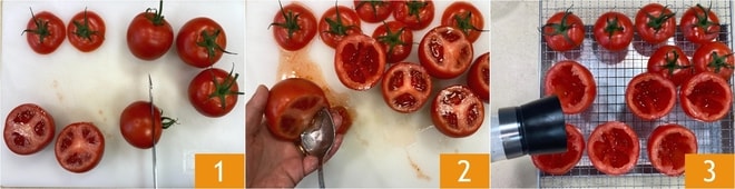 Para preparar los tomates rellenos de la abuela, primero cortad las tapas de los tomates 1 y reservadlas, luego vaciad la pulpa con la ayuda de una cuchara y reservadla también 2. Salpimentad ligeramente el interior de los tomates 3.