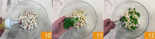 Añadir un chorro de aceite 10 y algunas hojas de albahaca trituradas 11, mezclar 12 y dejar macerar a temperatura ambiente durante 30 minutos.