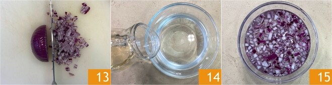 Mientras tanto, limpiad y picad la cebolla 13. Verted el agua y el vinagre en un bol 14, sumergid la cebolla picada y dejadla en remojo durante 10 minutos 15.